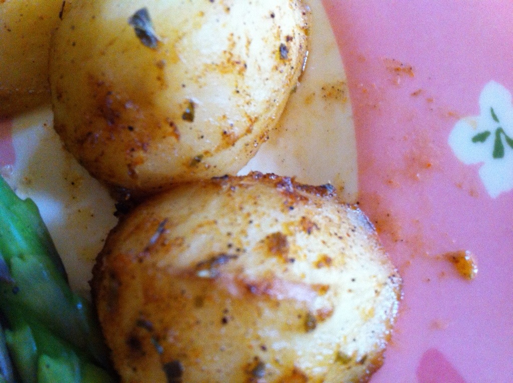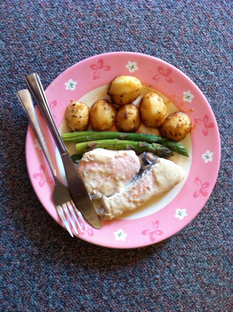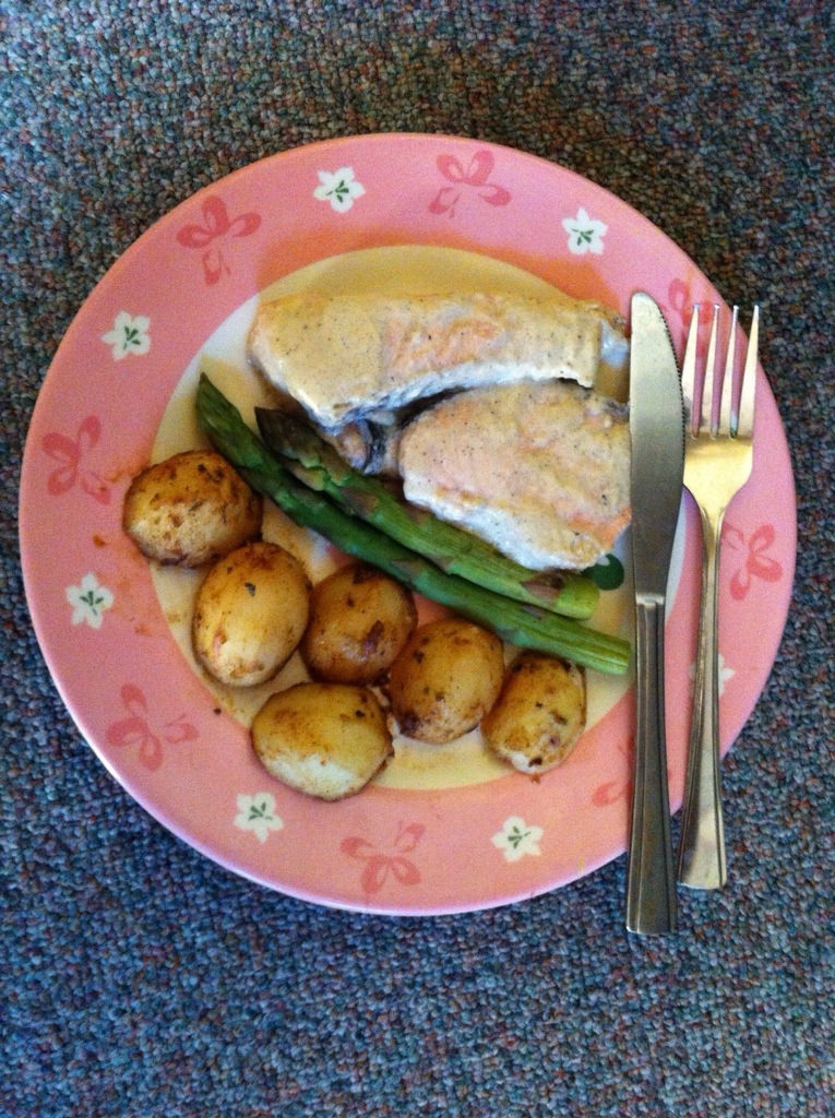 So I served this up some asparagus and baked potatoes for myself and my little brother Alvi. I seasoned the potatoes with the same spices I use when I make wedges at home. I thought this salmon tasted so nice, and it wasn’t too salty or bland. It was just right.