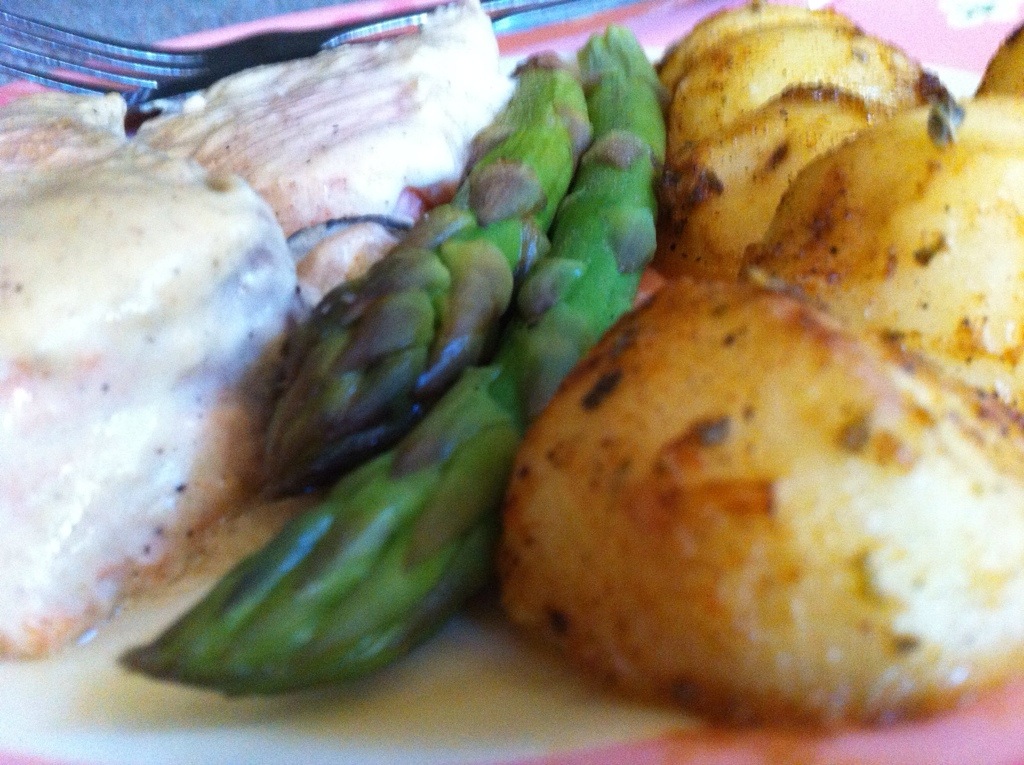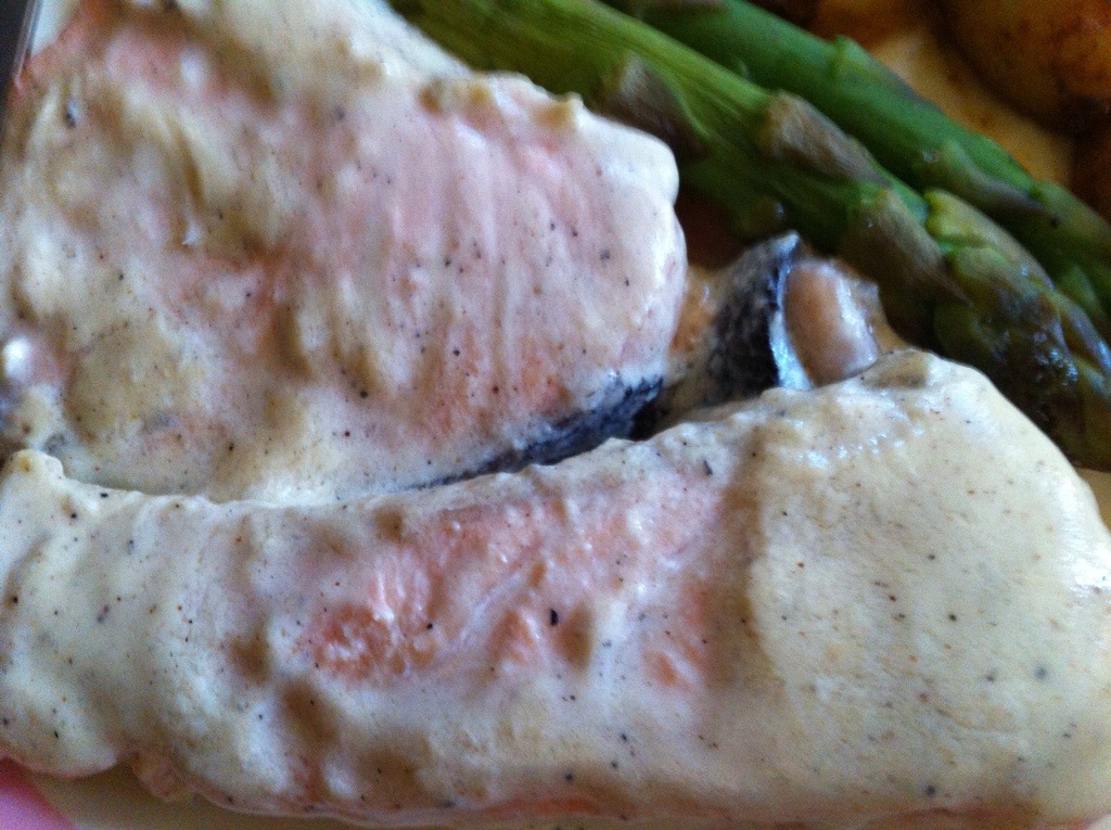 - Blanched asparagus complements the salmon really well, and baked potatoes.